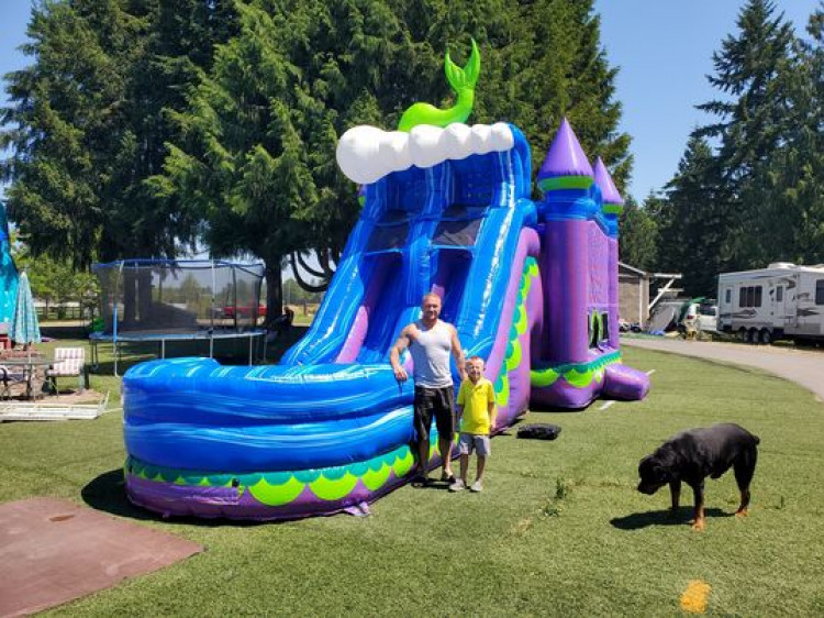 6-In-1 Dual Lane Combo is a Mermaid's underwater playground. Features an 8' dual lane slide w/inflated landing zone for dry use. Also includes climbing wall, basketball hoop, obstacles, and tunnel. Tale can be folded down and stored away if not needed.